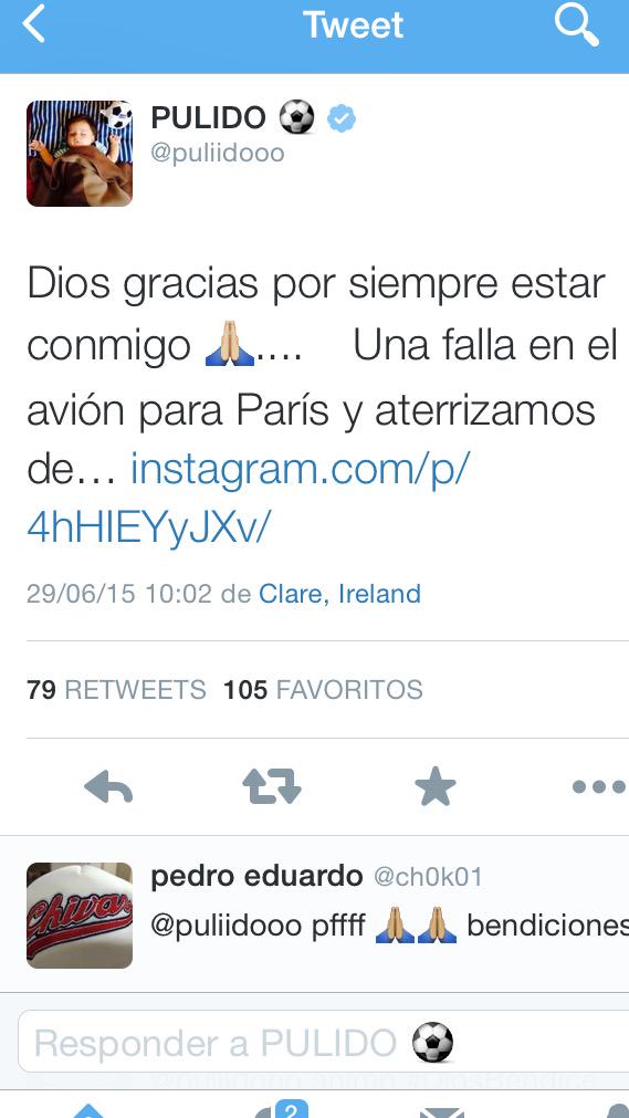 “Dios gracias por estar siempre conmigo…Un falla en el avión para París y aterrizamos de emergencia, en Irlanda, pero todo bien, estamos a salvo…Sin duda una experiencia inolvidable que no le deseo a nadie. #dios es grande”, escribió el jugador.
