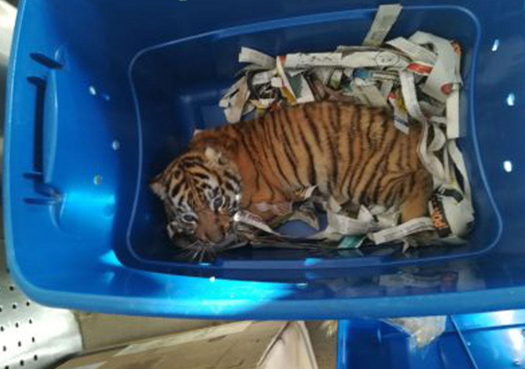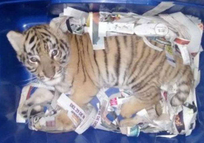 Un pequeño tigre de bengala, aproximadamente de dos meses, fue interceptado por un perro de la División de Fuerzas Federales cuando pretendía ser transportado de Jalisco a Querétaro adentro de una caja, sedado y sin alimento.