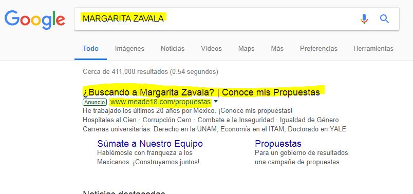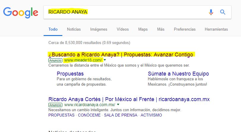 Lo cierto de todo esto es que el equipo de campaña de Meade utilizó los nombres de sus opositores para pautar en Google Adwords y lograr que, al buscar información sobre cualquier candidato, aparezca publicidad de su campaña, señala Notimex.