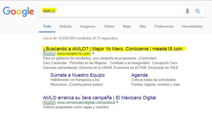 “¿Buscando a AMLO? | Mejor Yo Mero. Conóceme | meade18.com”, es la primera respuesta que arroja Google cuando intentas buscar información sobre Andrés Manuel López Obrador o cualquier otro candidato presidencial como Margarita Zavala o Ricardo Anaya.