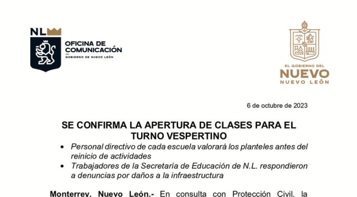 La Secretaría de Educación de Nuevo León ha confirmado que las clases en el turno vespertino de Educación Básica se llevarán a cabo este viernes, gracias a la disminución del riesgo y la presencia de lluvias en la entidad.