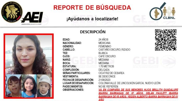 En la colonia Valle de Lincoln, del municipio de García, se reportó la búsqueda de una madre y sus tres hijos menores de edad, que desaparecieron el pasado 21 de agosto, de acuerdo a la ficha emitida por la...
