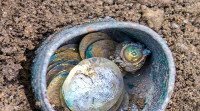 Se trata de un pequeño cofre de bronce con 24 monedas de oro...