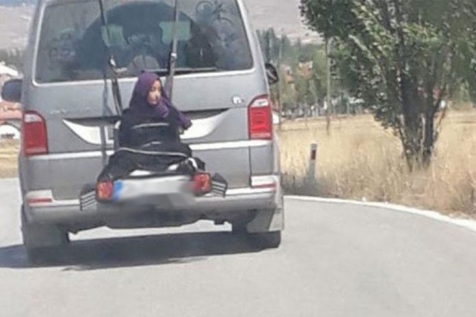 Usuarios de redes sociales han marcado la gran irresponsabilidad e imprudencia de un padre de familia que llevaba a su hija atada en el portabicicletas de su camioneta mientras transitaba por una carretera rural al norte de Turquía.