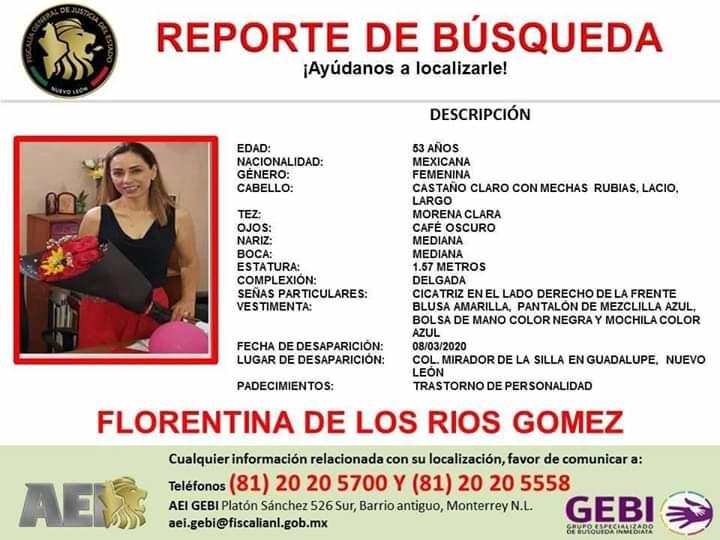 La mujer responde al nombre de Florentina de Los Ríos Gómez, de acuerdo a la ficha de búsqueda emitida por la Fiscalía de Justicia del Estado.