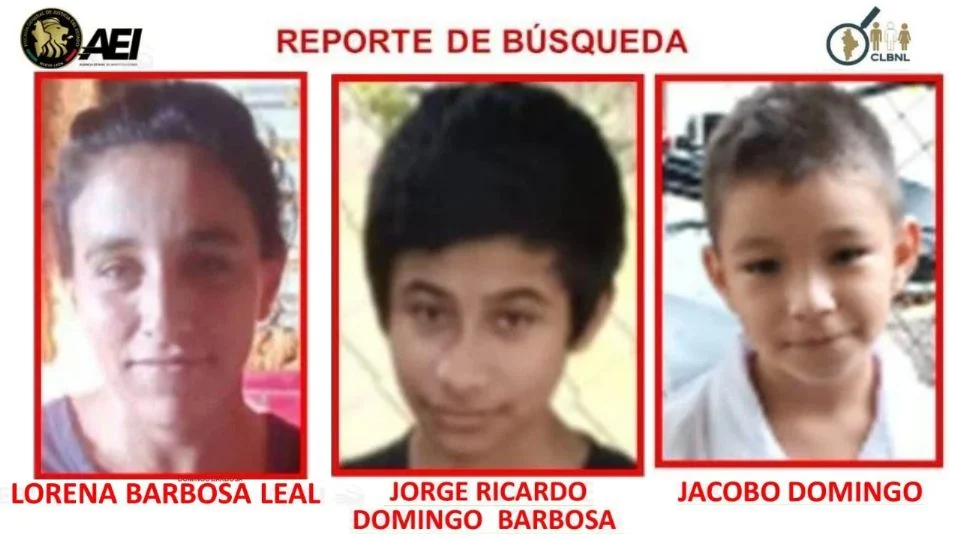 La Fiscalía General de Justicia del Estado de Nuevo León activó fichas de búsqueda para localizar a Lorena Barbosa Leal, de 30 años, y a sus hijos Jorge Ricardo, de 15 años, y Jacob Domingo Barbosa, de 7, quienes fueron vistos por última vez en el Ejido Abras de Arriba, en cadereyta.