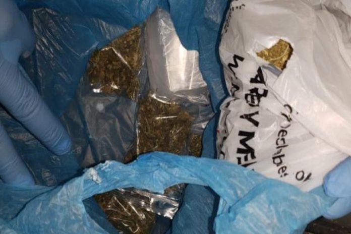 Fueron detenidos Francisco Javier A de 48 años y José Guadalupe O de 46, además del aseguramiento de cuatro envoltorios de plástico con hierba con las características de las marihuana y bolsa que contenía más de este enervante.