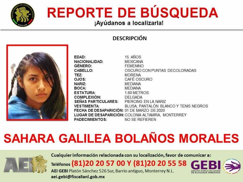 La Fiscalía General de Justicia emitió una ficha de búsqueda por la desaparición de una menor de 15 años de edad, en la colonia Altamira en el municipio de Monterrey.