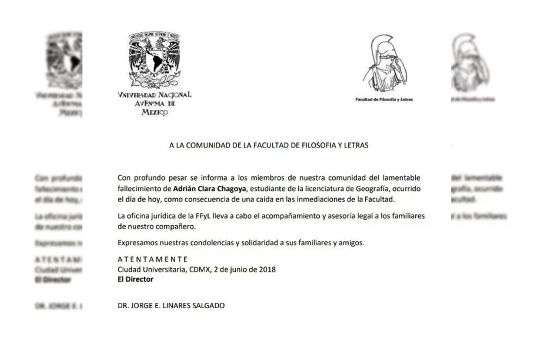 “Con profundo pesar se informa a los miembros de nuestra comunidad del lamentable fallecimiento de Adrián Clara Chagoya, estudiante de la Licenciatura en Geografía, ocurrido el día de hoy (sábado), como consecuencia de una caída en las instalaciones de la Facultad”, se puede leer en el comunicado.