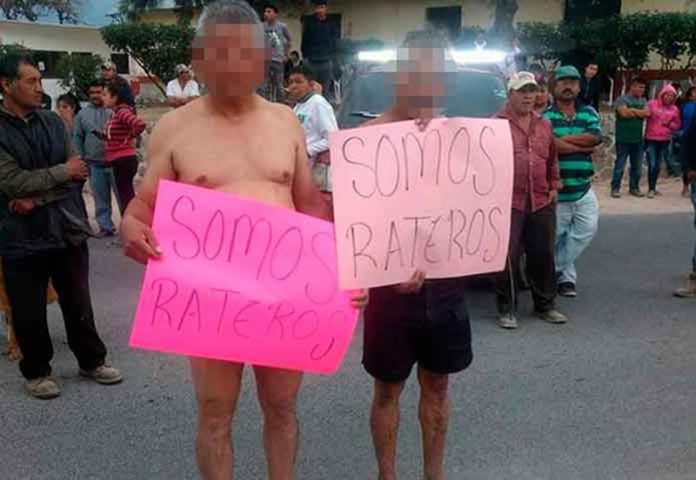 Los sujetos fueron obligados por habitantes de la comunidad a desnudarse y portar cartulinas con mensajes en los que se les señalaba como ladrones.