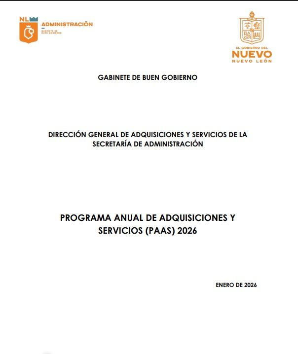 El Gobierno de Nuevo León, a través de la Secretaría de Administración, hizo pública la Agenda de Compras para el ejercicio 2026, también conocida como Programa Anual de Adquisiciones y Servicios (PAAS), con el objetivo de fortalecer la rendición de cuentas, la eficiencia del gasto y fomentar la competencia entre proveedores.