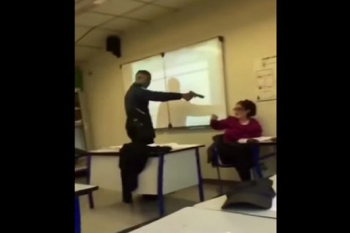 En redes sociales se viralizó un video donde un chico apunta con un arma de juguete a su maestra, mientras ella se encuentra distraída. Los hechos se registraron la semana pasada en la secundaria Édouard Branly en las afueras de París.