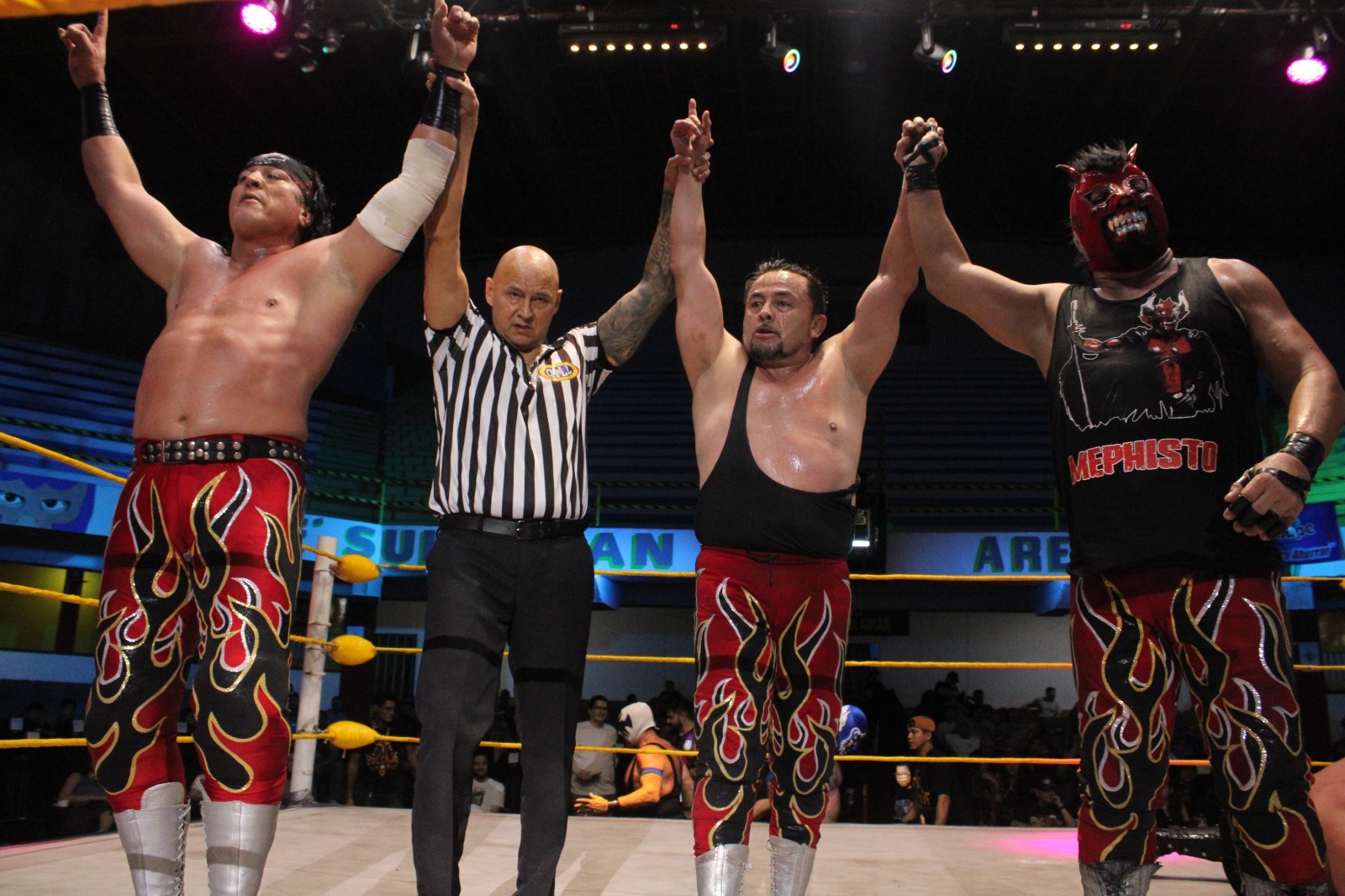 La Lucha Estelar cerró la noche con los técnicos Atlantis, Rey Hechicero y Blue Panther Jr enfrentando a los rudos Los Infernales: Euforia, Averno y Mephisto. En la primera caída, el apoyo del público se hizo sentir con gritos de “Hechicero, Hechicero”, pero los rudos tomaron ventaja cuando Euforia atacó por la espalda, llevándose la caída. En la segunda caída, los rudos continuaron dominando hasta que Rey Hechicero reaccionó con un rodillazo sobre Averno, liderando la remontada técnica para empatar. En la tercera y definitiva caída, la lucha se volvió intensa con el clásico toma y daca, destacando el enfrentamiento entre Euforia y Hechicero. Sin embargo, la polémica apareció cuando Hechicero golpeó accidentalmente al referee, lo que fue aprovechado por Euforia para quitarle la máscara y asegurar la victoria para Los Infernales, con el conteo final.