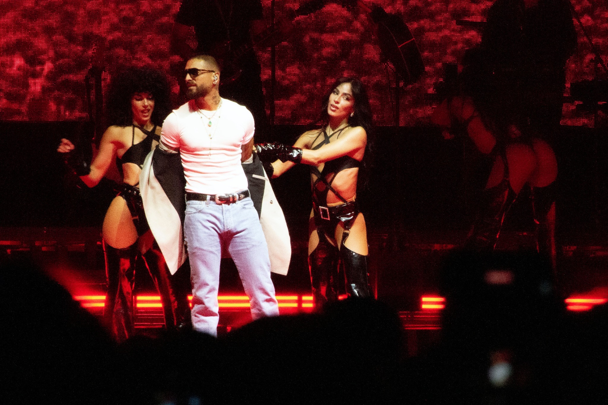 El ambiente subió aún más con temas como “Vente pa’ ca” y “Felices los 4”, en los que el colombiano deslumbró con sus movimientos de baile, robándose el escenario. Uno de los momentos más esperados llegó con “Hawái”, coreada a todo pulmón por los asistentes.