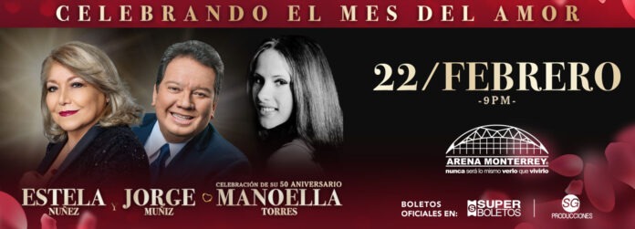 La Arena Monterrey se prepara para vivir una velada romántica en el 50 Aniversario de Manoella Torres, junto a Estela Núñez y Jorge Muñiz, este jueves 22 de febrero a las 21:00 horas.