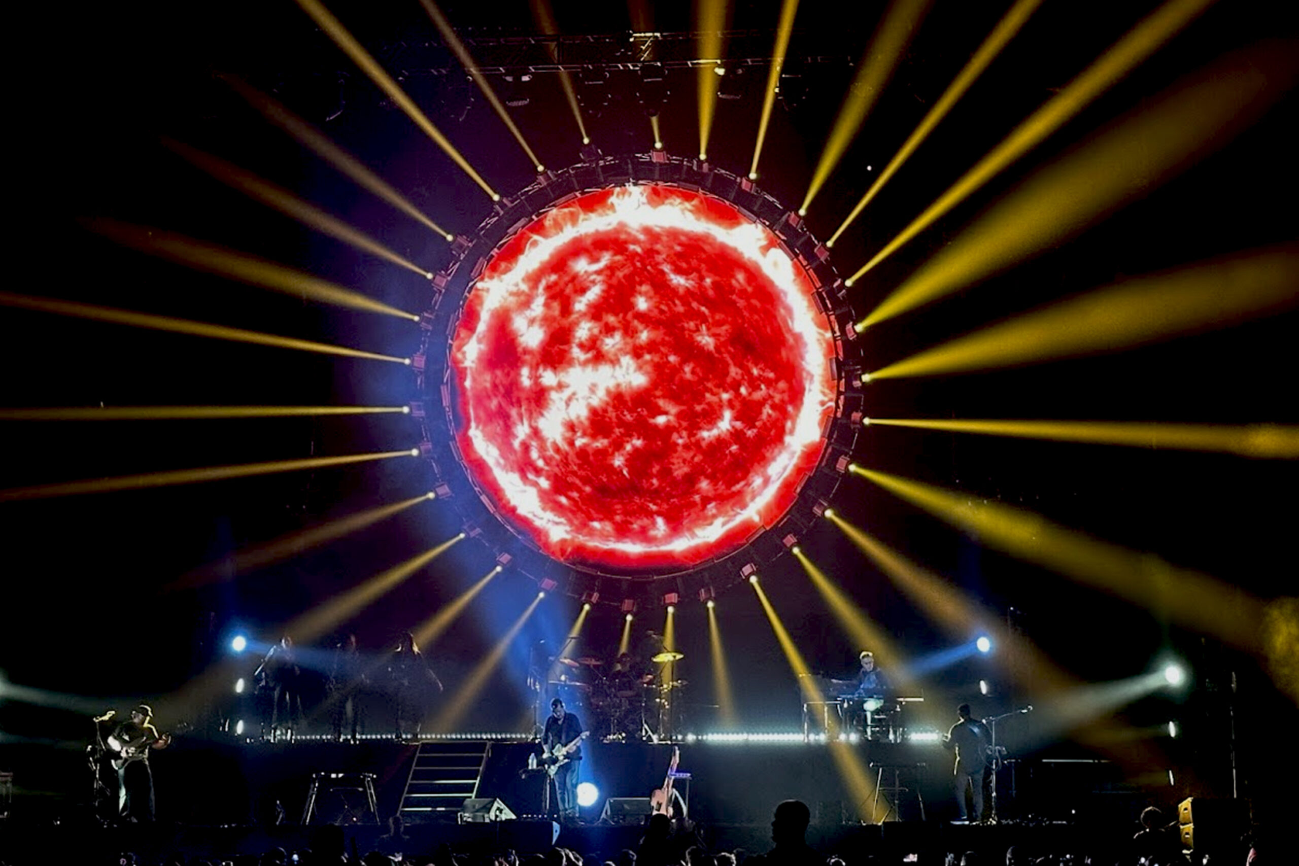 La velada arrancó con “Coming Back to Life”, tema suficiente para encender la nostalgia entre los asistentes. La pantalla circular —elemento característico de los shows de Pink Floyd— permaneció apagada hasta que llegó “Fat Old Sun”, del mítico Atom Heart Mother, cuando un sol proyectado dio inicio al viaje psicodélico.