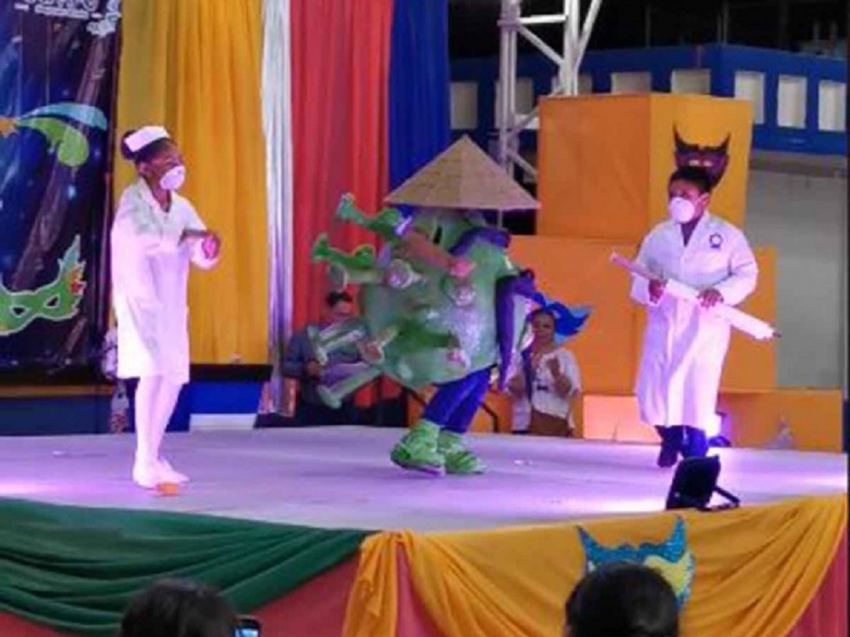 Entre los diversos disfraces, el niño rápidamente llamó la atención con su ‘botarga’ redonda relacionada con el virus.