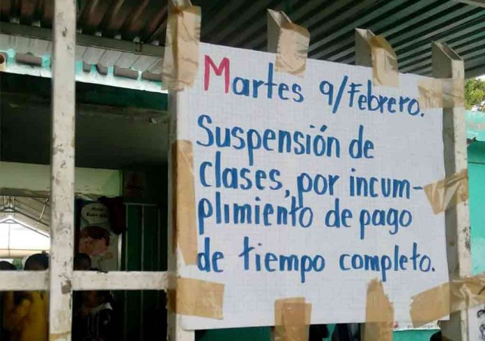 La suspensión de este programa se debe a que la Secretaría de Educación del Estado no le ha pagado a los maestros desde hace tres quincenas, obligándolos a modificar el horario de termino escolar, de las 4:00 de la tarde a las 12:30 del mediodía.