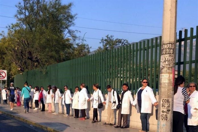 Durante esta mañana, doctores regiomontanos portaron sus batas blancas y realizaron una cadena humana para protestar pacíficamente en contra de la criminalización de su trabajo, a fuera de la Clínica 25 del IMSS.