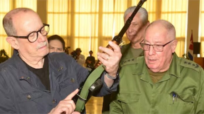 En un acto simbólico durante el Día Nacional de la Defensa, la jefatura militar cubana entregó un fusil de combate al cantautor Silvio Rodríguez, luego de que el músico declarara que defendería la isla ante un posible ataque de Estados Unidos. La ceremonia fue difundida en la cuenta oficial de la presidencia en X.