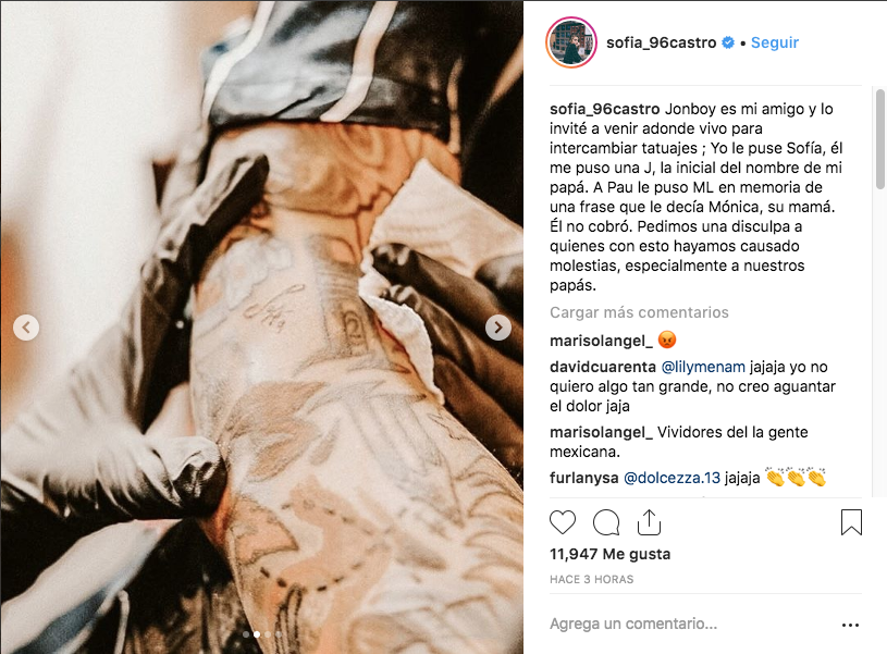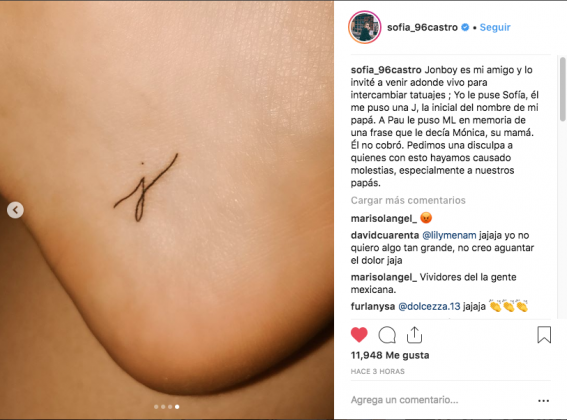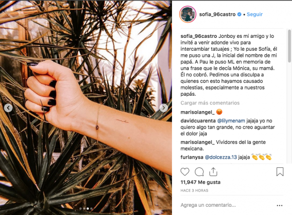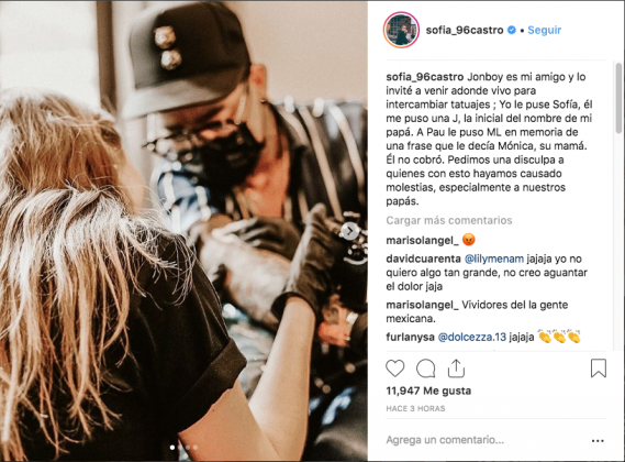 “Jon Boy es mi amigo y lo invité a venir a donde vivo para intercambiar tatuajes; Yo le puse Sofía, él me puso una J, la inicial de mi papá. A Pau le puso ML en memoria de una frase que le decía Mónica, su mamá. Él no cobró”, explicó la joven mediante su cuenta de Instagram.